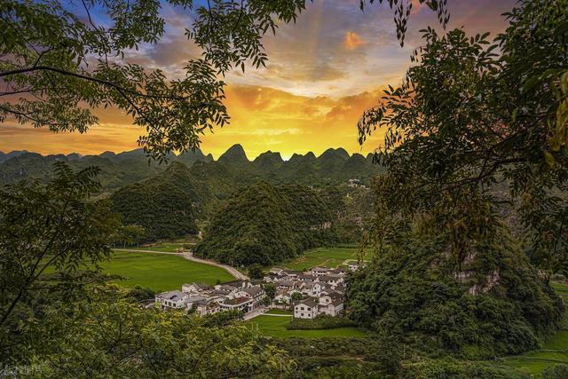 万峰成林,自然画框。稻浪翻涌的布依村寨里,日间如水墨画。万峰林暮色,夕阳把群峰染成黛青,纳灰河碎银般精通。