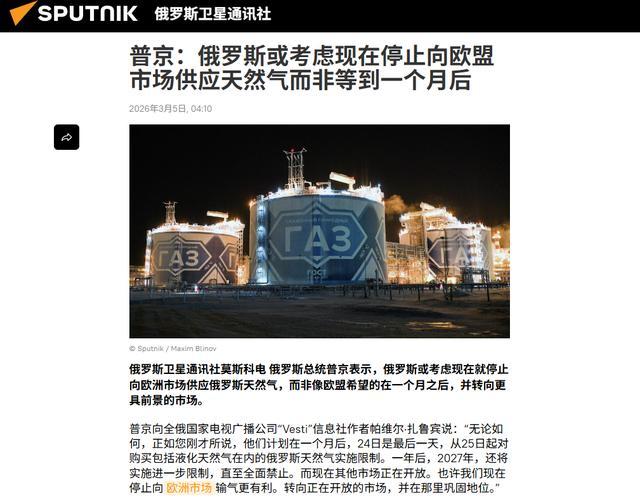 据俄罗斯卫星社报谈,当地时间3月4日,普京在吸收俄国度电视台著明记者帕维尔·扎鲁宾(Pavel Zarubin)采访时,走马看花地暗示,住手对欧自然气供应的联系事宜,宜早不宜迟,俄罗斯应该就应该加以酌量,而不是还要比及一个月以后。