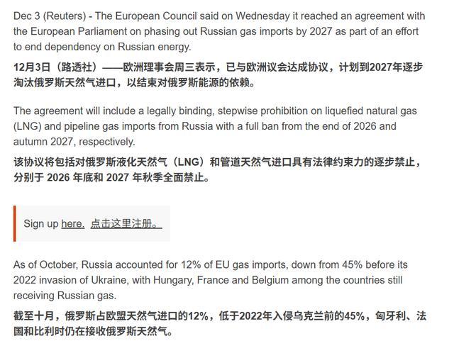 如果是在“4个月以前”,欧洲东谈主听到这条音信应该还挺欢乐的。因为在旧年12月初,欧洲理事会曾与欧洲议会达成过一项公约,经营在2026年4月底之前全面阻截新的俄罗斯短期液化自然气合同,并在2027年底前皆备堵截所有这个词俄罗斯管闲聊然气的入口,绝对罢了对俄动力依赖。