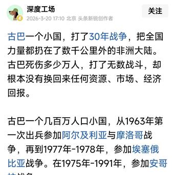 网友表现,古巴30年间,曾参与非洲多国战争,包括阿尔及利亚,摩洛哥,埃塞俄比亚,安哥拉,刚果(布),几内亚,莫桑比克与贝宁等国度。
